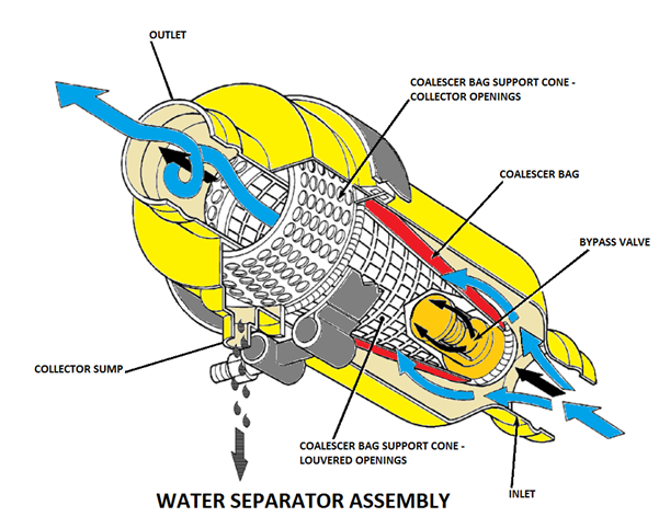 All Challenger 600 series aircraft are equipped two cooling packs each containing a water separator located downstream of the cooling pack. Cold air from the turbine section of the air cycle machine passes through the water separator before it gets distributed into the cabin and cockpit areas. When hot bleed air converts to cold during the air expansion process, any air moisture will condense to form a fine mist and the purpose of the water separator is to remove this misty air before distribution. As cold air passes through the coalescer bag (aka: SOCK), the mist is converted to larger droplets of water. The mixture of air/water droplets is then forced through louvered openings on the coalescer bag support cone where the heavy water droplets get separated from the air. The water droplets accumulate at the bottom of the collector sump where it then gets routed to the water aspirator at the bottom of the cooling pack plenum. The aspirator sprays water directly to the core of the dual heat exchanger to cool it down.