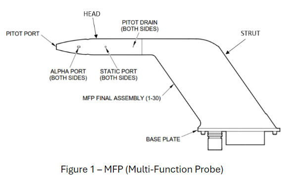 Examples include a dented lip on the pitot port, nose flat damage on the tip, damage on the edge of the angle of attack (AOA) port (also called Alpha ports), or contamination in the ports. See the multi-function probe (MFP), Figure 1. This damage or contamination may cause faulty altimetry or AOA issues during flight and lead to unscheduled removal of the ADSP.